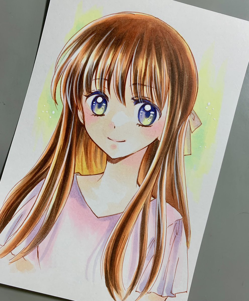 #このタグをみた人はド正面イラストを貼る #コピック 実は最近、定規で左右を測って描いてるんですが、やればやるほどに不自然になる😂🥹 そして3枚目は測ってなかったころこ絵です あんま変わらん??
