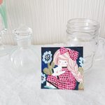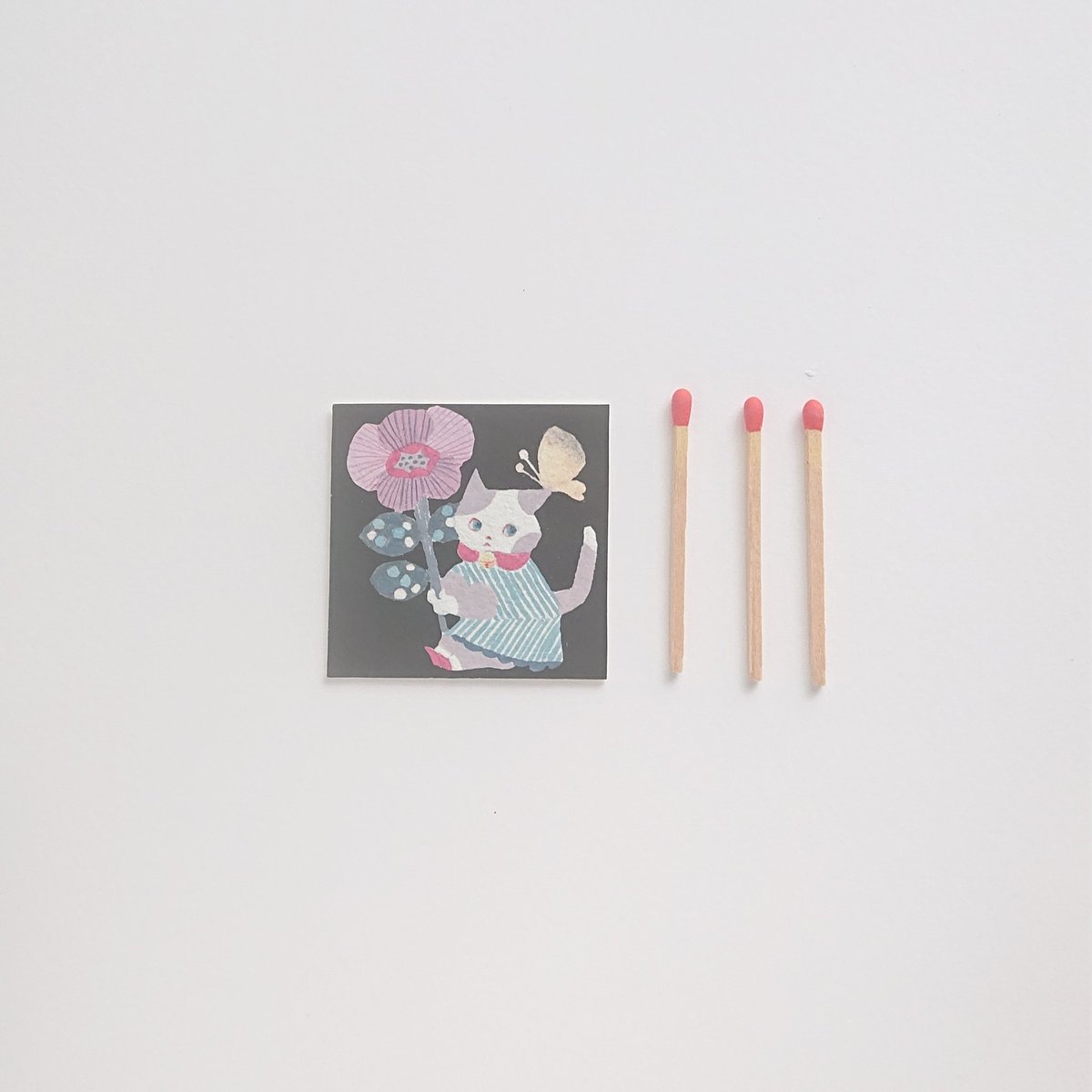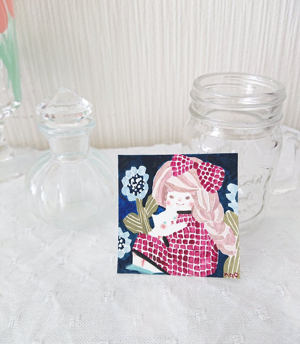 5cmの小さな絵。 花とネコと女の子。 #イラスト #水彩