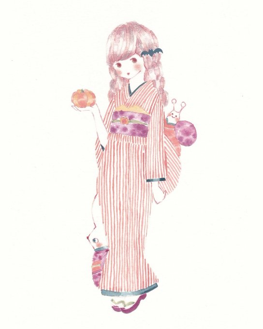 お着物のハロウィンコーデ 🎃🐌🐇 #イラスト #水彩