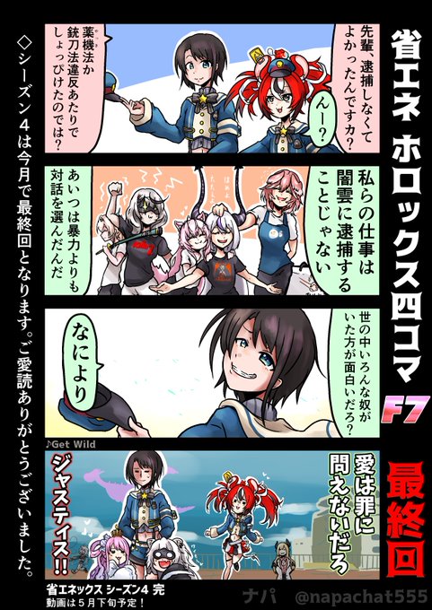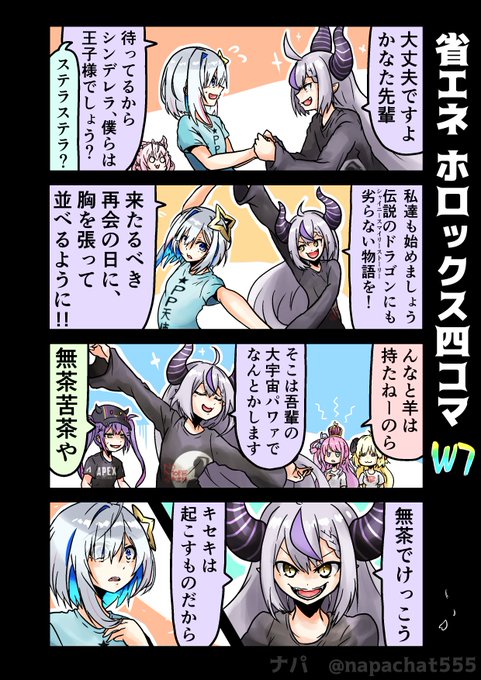 省エネ ホロックス四コマ F7(終) 止めて引くので一旦まとめます。後番組、 ホロックス四コマW(ワールド)にご期待ください #プロテインザスバル #ベーアート #laplus_artdesu #Luillust #さかまた飼育日記 #こよりすけっち #いろはにも絵を #hololive
