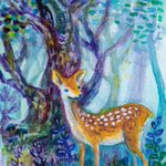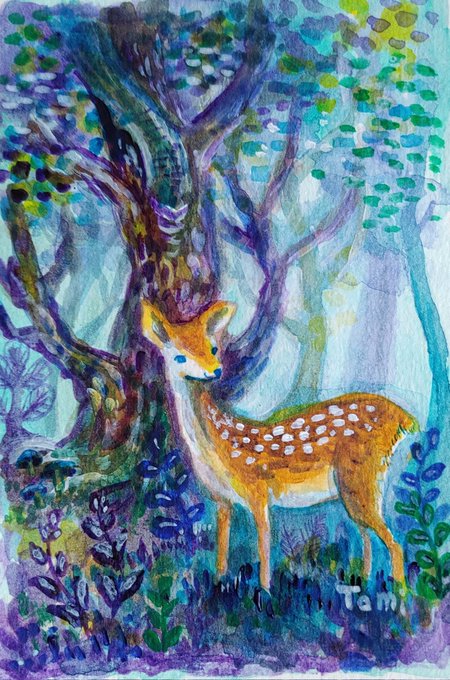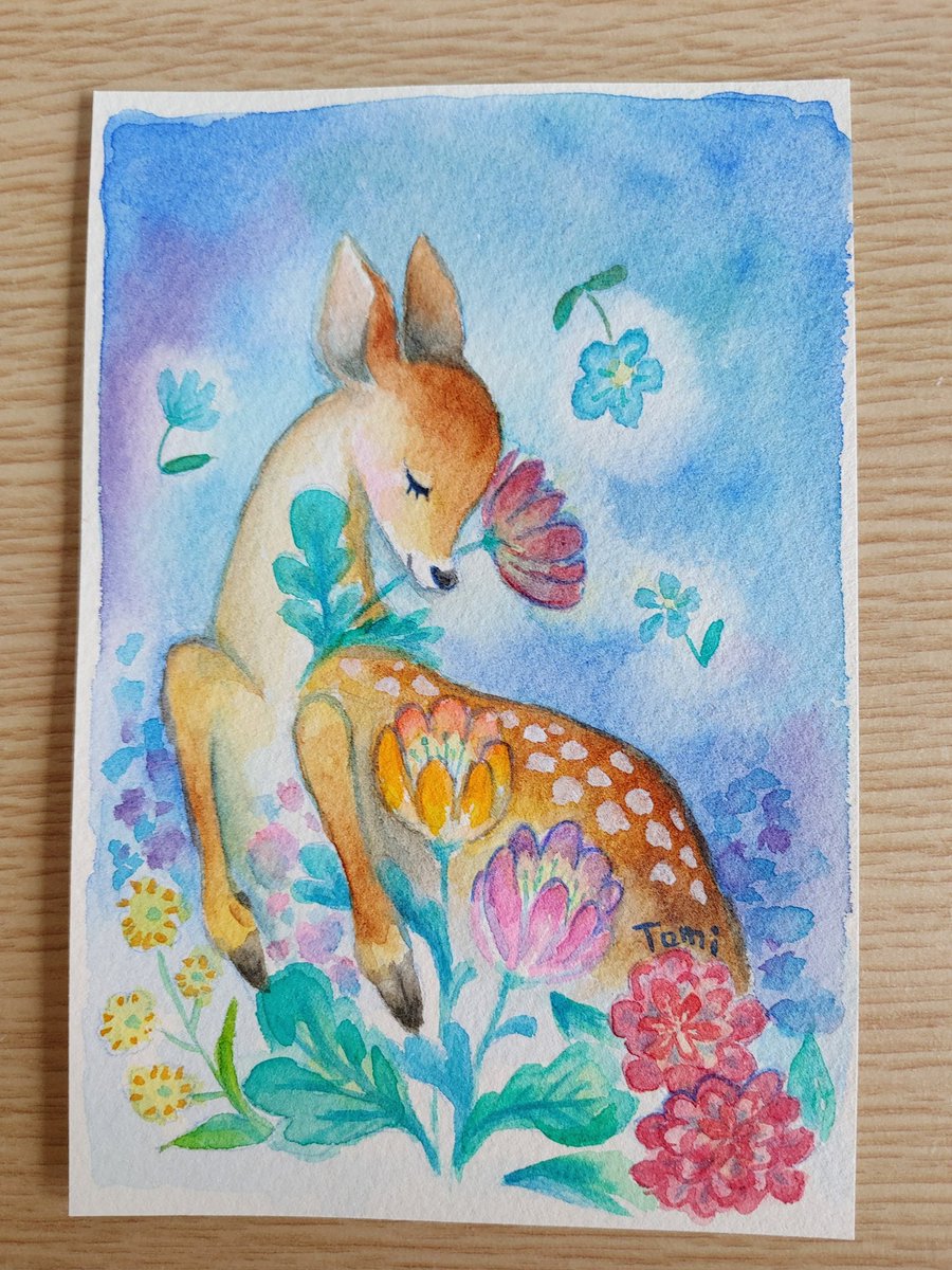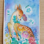5 48 昨日は一日薄暗かったので、刺繍を諦めて絵を描きました。 刺繍で作りかけの小鹿。 #透明水彩 22/10/08 07:34