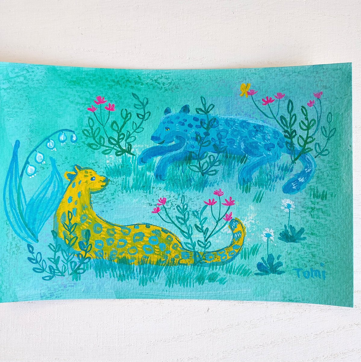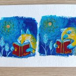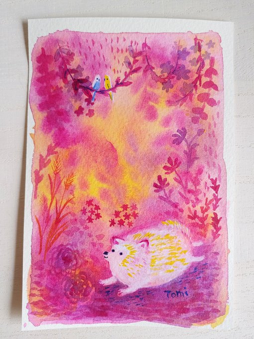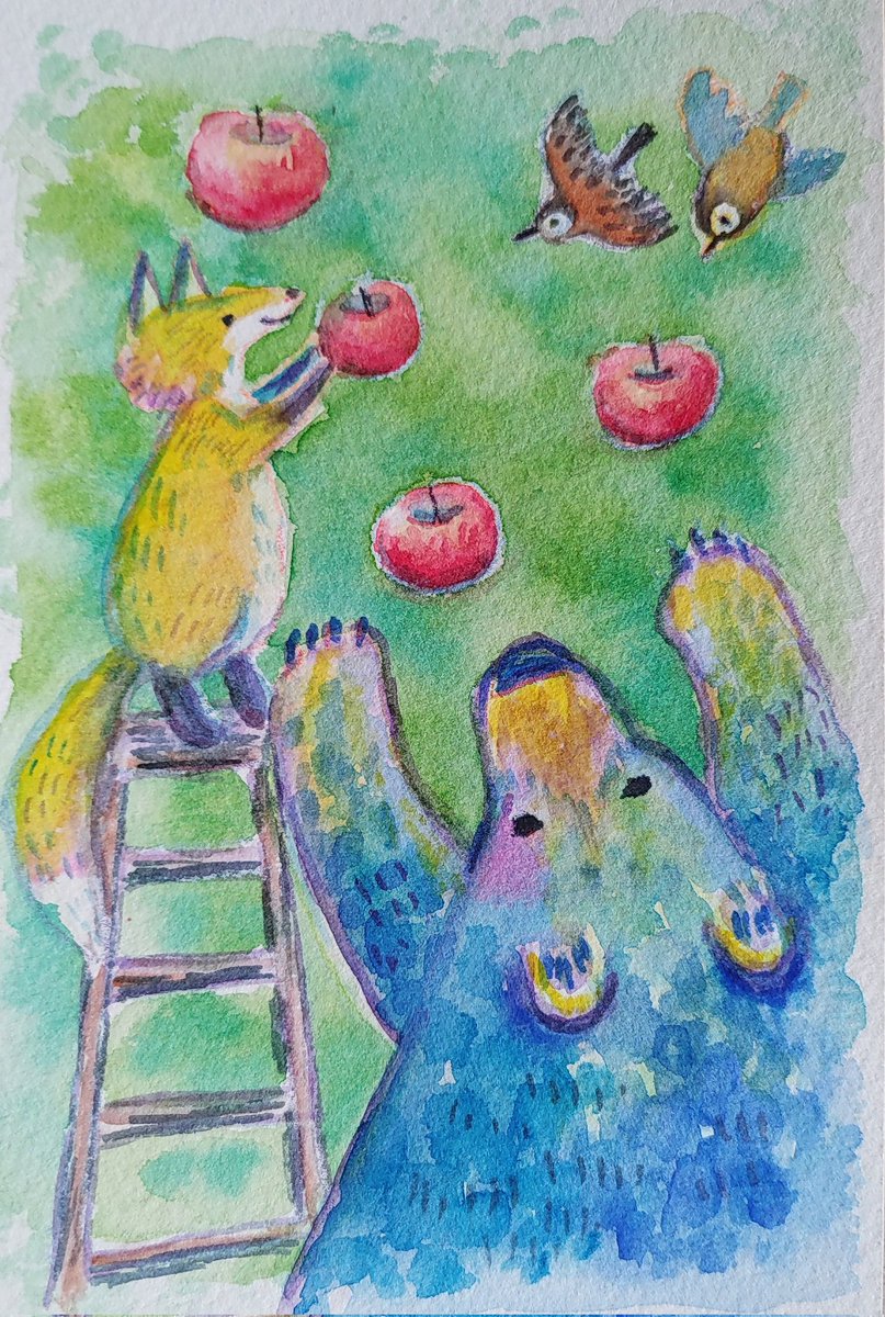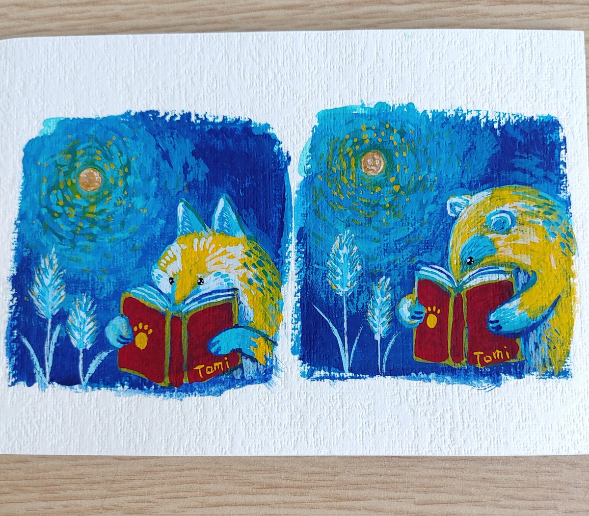 読書の秋😊キツネとアナグマ 小さな絵なので2枚くらい描いた方が絵の具が無駄にならなくて良いかも。 午前中天気が悪く部屋の中が薄暗かったので、刺繍はやめて絵を描きました。 #アクリルガッシュ