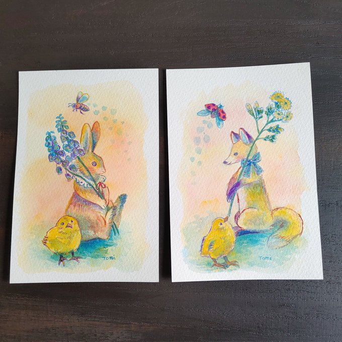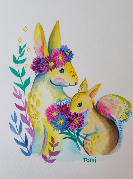 1 7 庭の花が綺麗なうちにお絵かき😊 キツネとうさぎと春の草花 水彩紙にアクリルガッシュ 細い線はネイル用の使い捨て筆 #イラスト 23/03/21 11:11