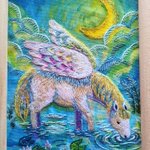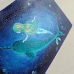 3 13 イッカクと人魚の絵😊不思議生物の組み合わせです。人魚とクラゲにキラキラ絵の具を使いました☆ ポストカードサイズに描きましたが裏が絶望的に汚れてしまいました( ゚ェ゚)どうしたものか 23/01/22 14:50