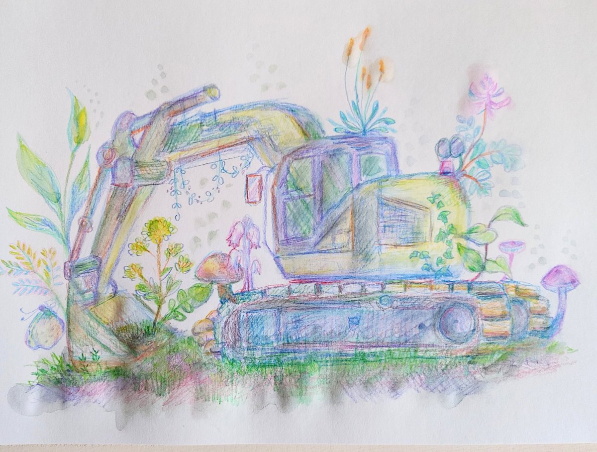 1 22 庭木をカットしてたら指までやってしまいました😥動いても痛い。何もしなくても痛い。集中して紛らすために絵を描きました( ゚ェ゚) いつか描こうと思って撮りためた写真を見ながら苦手な機械の絵。 画用紙に水彩色鉛筆 22/12/25 16:18