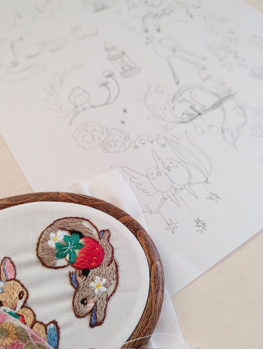 ブローチの接着剤が乾くのを待ちながら、次の刺繍絵の下絵を描きました😊 #布絵の具