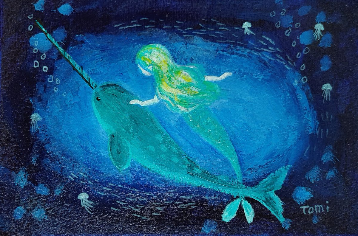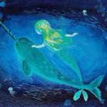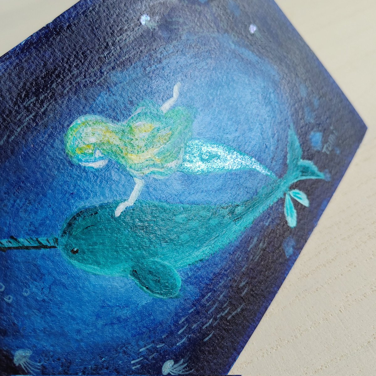 イッカクと人魚の絵😊不思議生物の組み合わせです。人魚とクラゲにキラキラ絵の具を使いました☆ ポストカードサイズに描きましたが裏が絶望的に汚れてしまいました( ゚ェ゚)どうしたものか