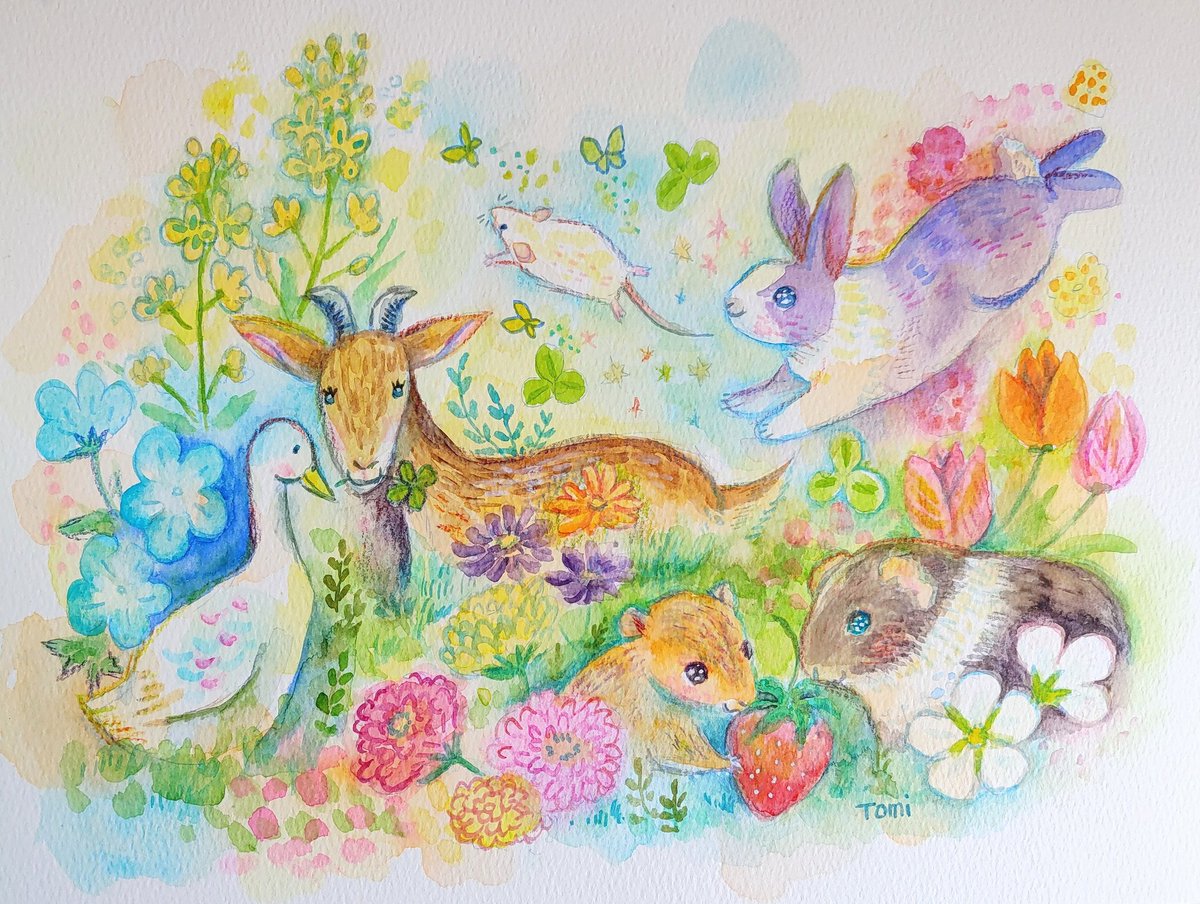 春の絵🌷 最近、触れる移動動物園の来てるイベントに行ったので沢山写真撮ってきました😊動物カワイソウと思ってしまうけど、子供達は触りたがる。 #透明水彩 #イラスト