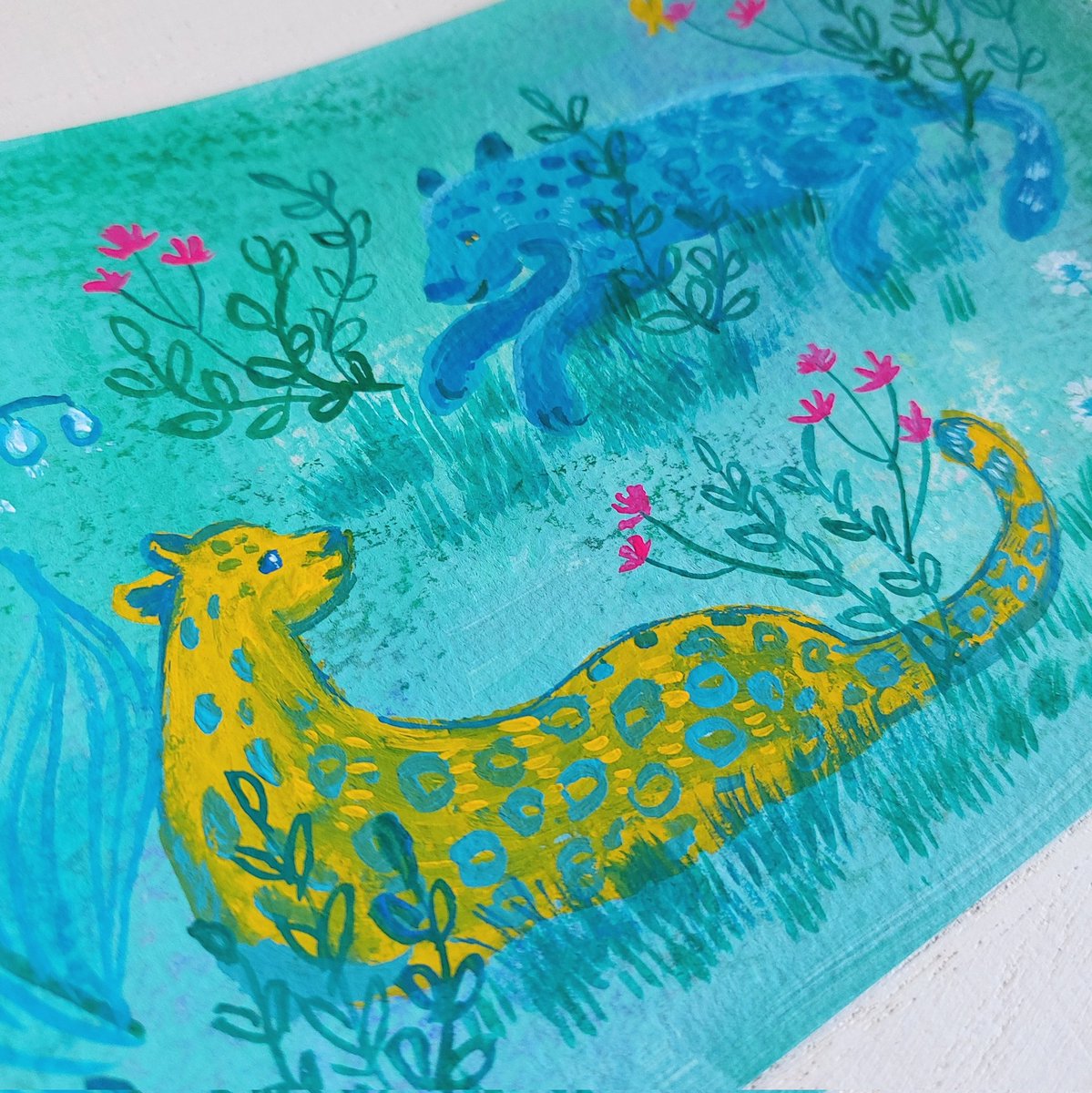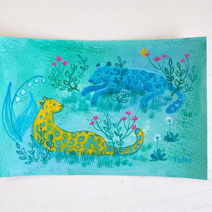 来年の干支の絵2枚 私調べでは来年のラッキーカラーは青とか緑らしいので取り入れて描いてみました😊 絵に合わせてフレームにも色付けします。 #ミニ原画