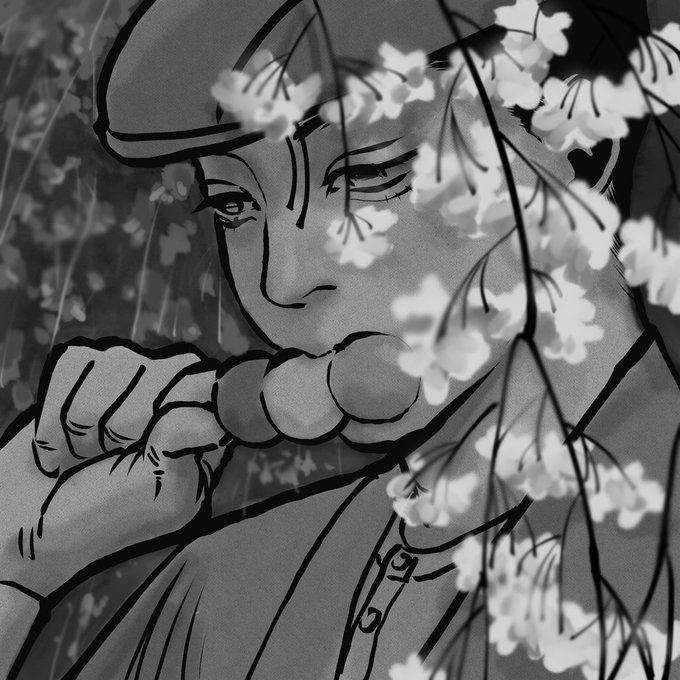#創作男子版深夜の真剣お絵描き60分一本勝負 お題【夜桜】 【三色団子】 今回も10分前後オーバーでございます...桜むずいですね!桜なしの差分も置いておきます。 お題ありがとうございました!!