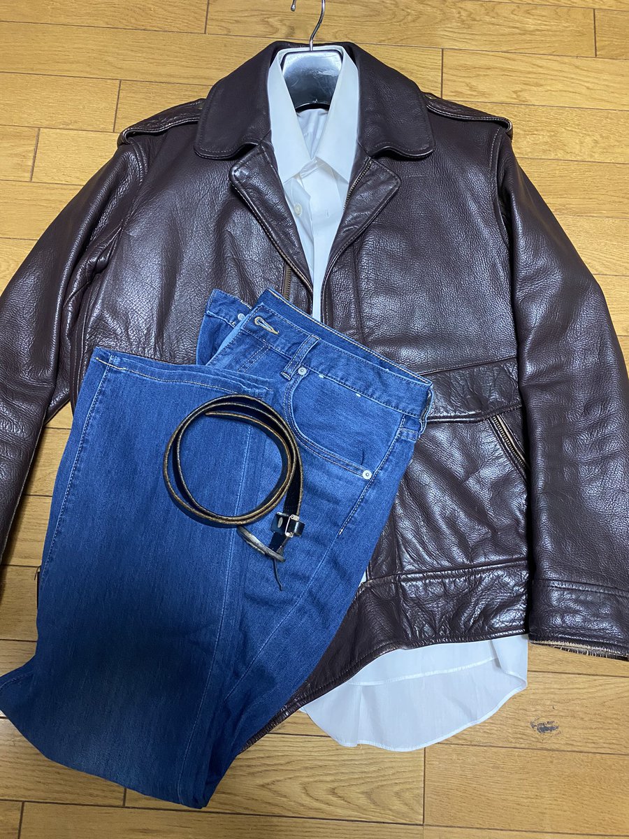 #デラスのお品書き 今日行った古着屋でいい感じのレザージャケット見つけて ベルさんの新衣装のコスがほぼ完成した ライダースジャケットじゃないのが残念だけどサイズがピッタリなジャケットなかなか無いからこれで行こう