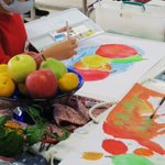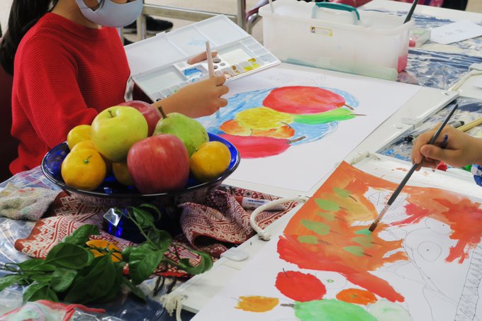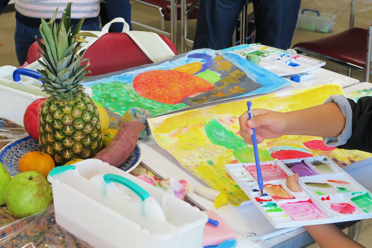 ★ヤングスペースなりた チャレンジ道★ 本日はチャレンジ《水彩画》を開催いたしました。画用紙いっぱいに色鮮やかなフルーツを描きました🍎🍍🍊🍐 #成田国際文化会館 #ヤングスペースなりた #水彩画