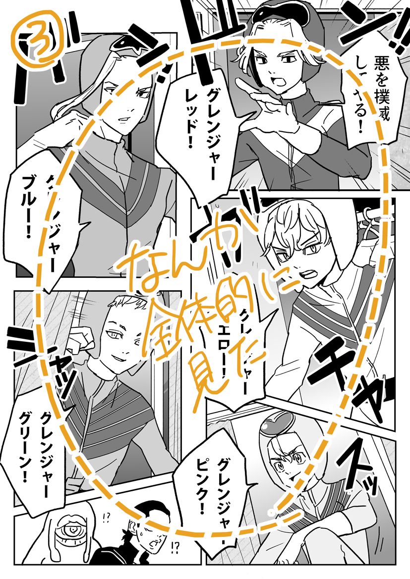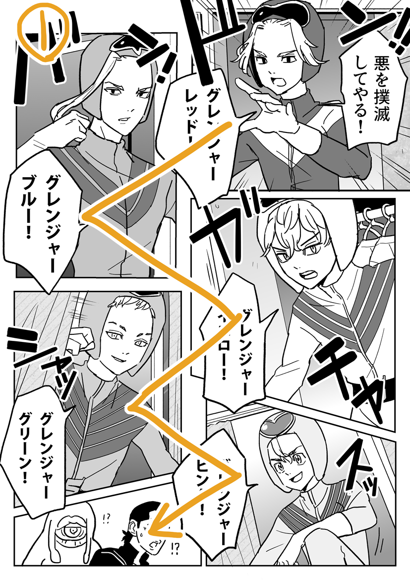 【🎍愛され】東i卍戦隊グレンジャー pixiv.net/artworks/10452… これを読んで下さった方にちょっとアンケートお願いしたいのですが、2P目をどんな順番で読みましたか? ホントは①のように読ませたかったのですが、実際どうだっただろうと思って…
