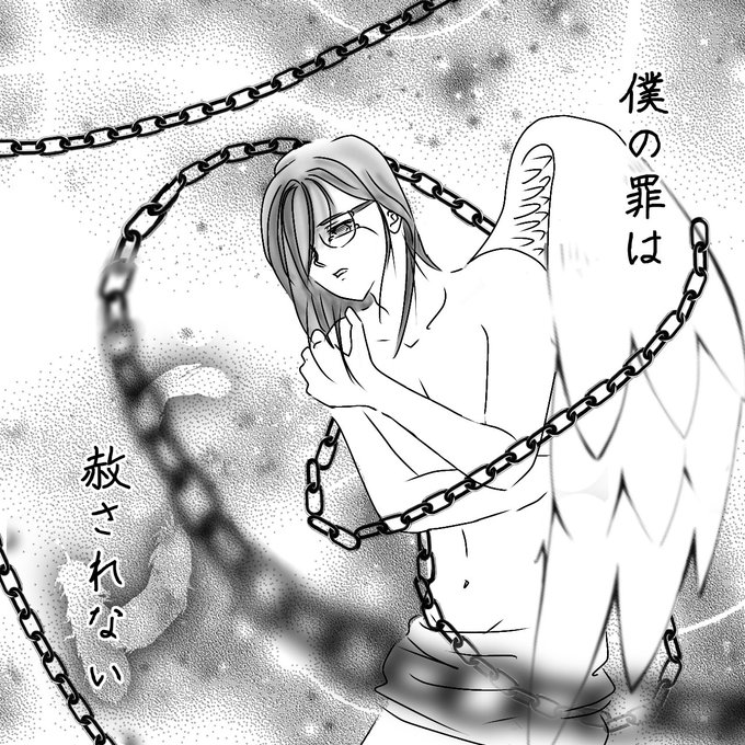 #みんな今の画力で半裸で鎖に絡まれながら天使の羽の片方を失われていて片目を隠す髪型で自分を抱き締めて僕の罪は赦されないーーって言ってるキャラ描いて 鯛さんに誘われ描いてみた。これが誰とは言えない💦