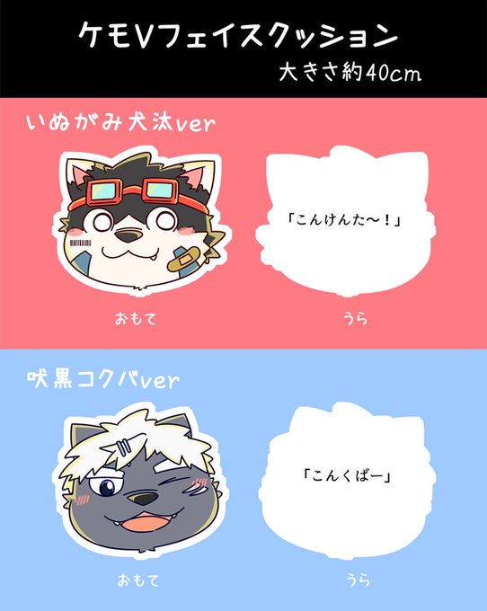 けもケット13でケモVフェイスクッション出します いぬがみ犬汰君、吠黒コクバ君の2バージョンです 大きさ約40cmなので結構大きめ 表面はサテンのようなさらっとした生地になってます