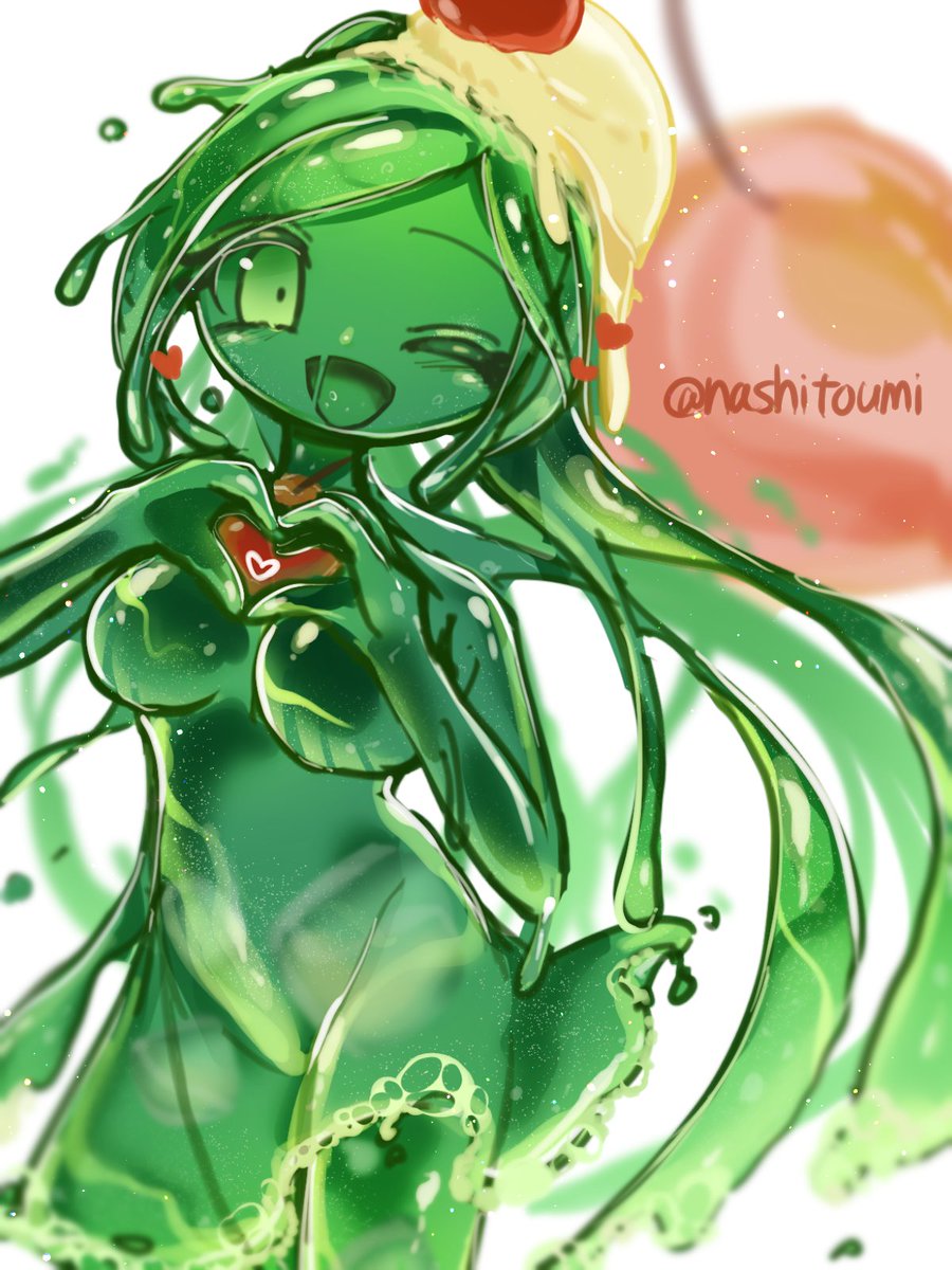 19 49 お題「炭酸飲料」 クリームソーダちゃん🍈💚❤️ #スライム娘版深夜の真剣お絵描き60分一本勝負 23/07/23 21:02