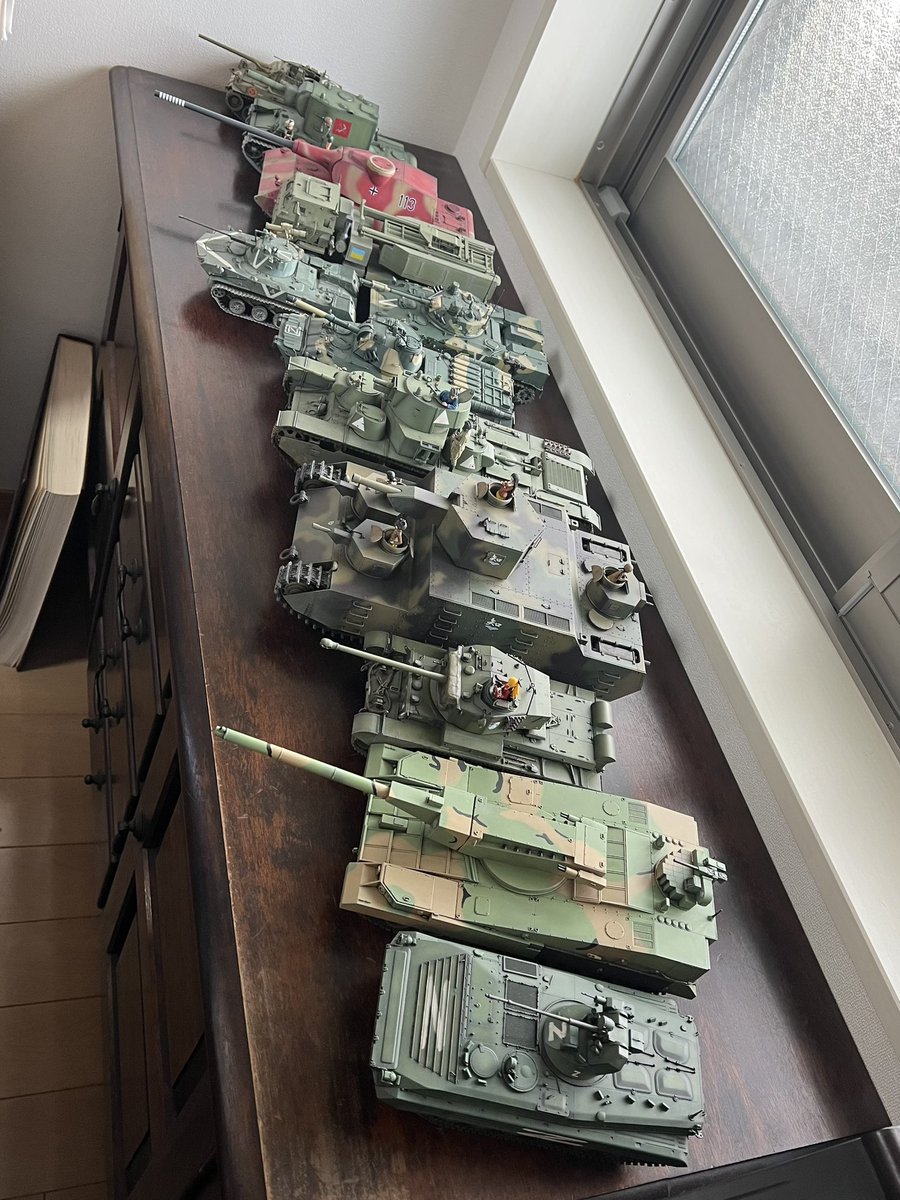 今年は12輌でした。並びきらないのでBMD兄弟は縦列駐車……内訳は特別軍事作戦6、ガルパン3、その他3って感じですね。今年も見てくださった方々ありがとうございました。来年もよろしくお願いいたします。皆様良いお年をお迎えくださいませ。 #今年作ったプラモ晒そうぜ