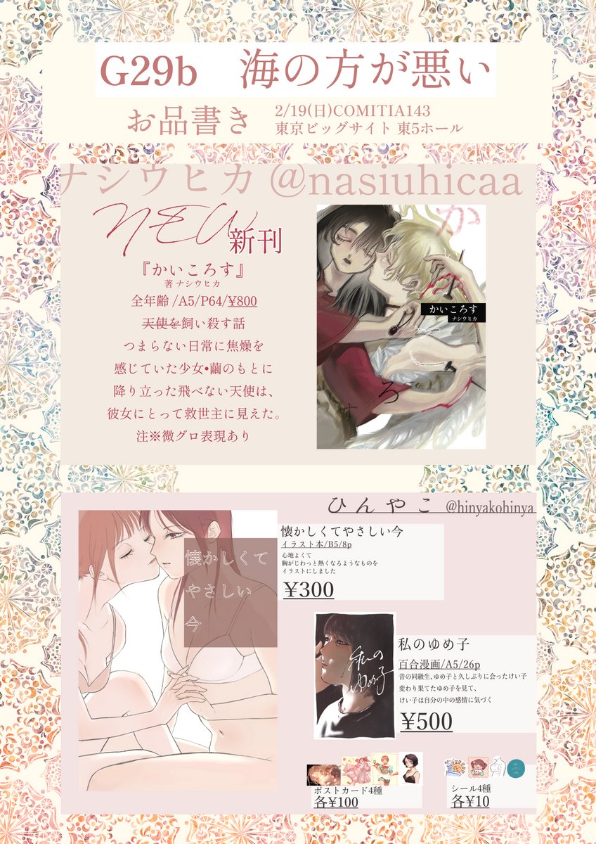 2/19(日) #COMITIA143 東京ビッグサイト東5ホール【G29b】 サークル名:【海の方が悪い】 お品書きです 私は64ページのハッピーサスペンス漫画新刊800円を出します〜 1000円で払ったら200円お釣りが来てお得ですね サンプル→ (1/4)