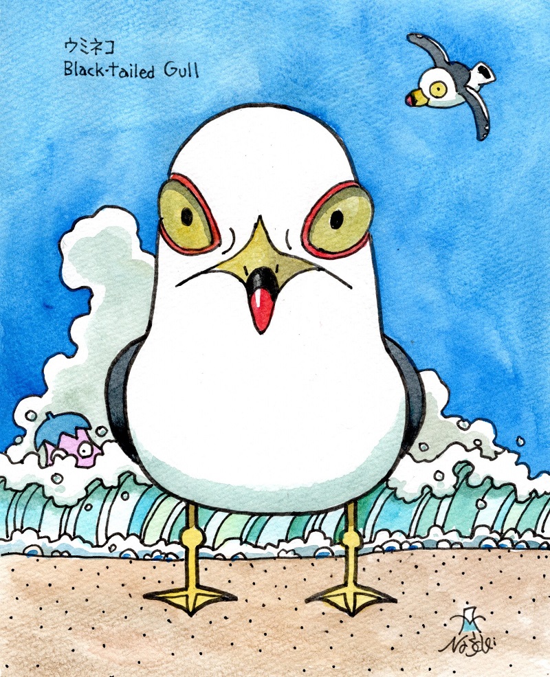 今日は一日中雨だったので鳥見には行けず。昨日海でいっぱい見たウミネコを描いてみた。