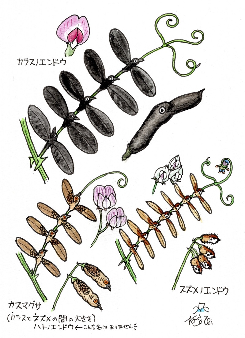 リクエストにお応えしてカラスノエンドウ、スズメノエンドウ、カスマグサを描いてみましたが、かなりの無理が・・・。 図を描いてる時は牧野富太郎の気分(^_^;)。
