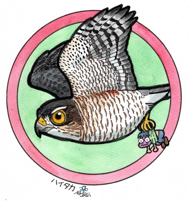 「缶バッジの鳥たち」、リクエストにお応えしてハイタカを描きました。