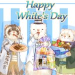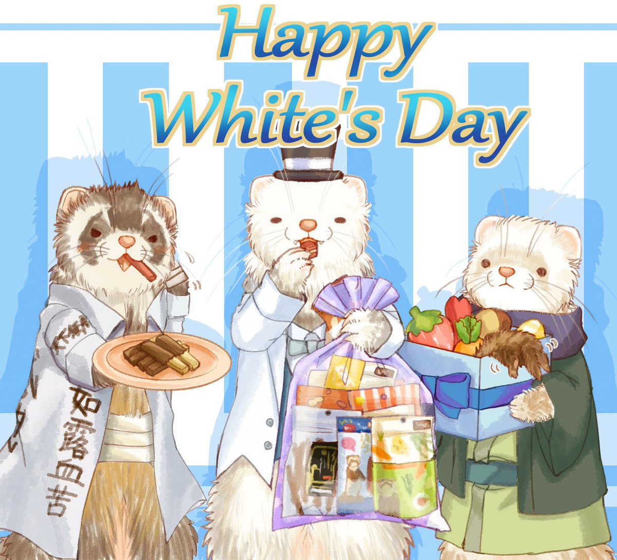 1 2 ハッピーホワイトデー🌹 左から 手作りキヌアバーバイトがけ ジャーキー詰め合わせ味見中 秘密基地からのお気に入りおもちゃ のお返しプレゼント🎁 #フェレット #イラスト 23/03/14 20:23