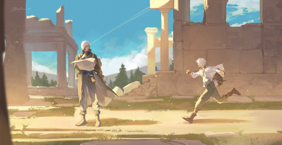 7 54 讓阿古跟小斯也去了異世界XD 應該是遺跡探索 ((第一次畫這類有分鏡感覺的圖 好 好累…_(:3」∠ )_ #イラスト #オリジナル 23/01/11 21:42
