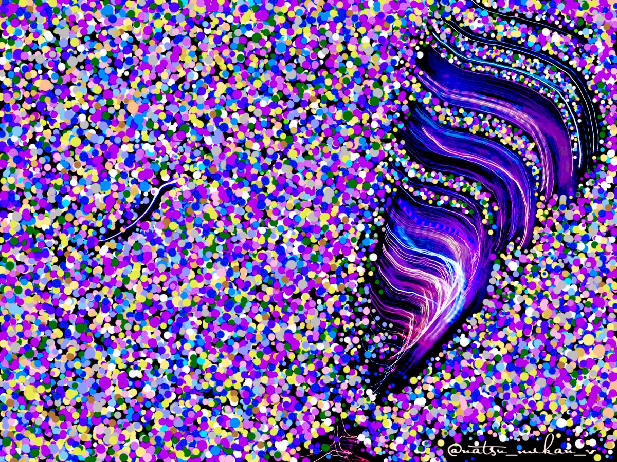曲線の光の写真の、真っ黒な余白部分に点でお絵描き🖋特にテーマは決めずに、なんとなくイメージした通りの色を重ねていくのが楽しい🎨 青とピンクと紫の組み合わせのサイバーっぽさ好きだな☺️ #抽象画 #創作 #絵 #イラスト好きな人と繋がりたい #イラスト #abstractart #art #colorful