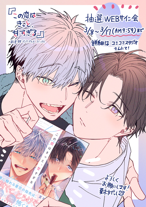 コミコミスタジオさんでの抽選WEBサイン会のお申し込みは明日17日AM9:59までとなっております~!ご興味がございましたらぜひ申し込んでやっていただけたら嬉しいです🥳どうぞよろしくお願いします🙇✨ #この恋はきっと甘すぎる twitter.com/dear_plus_/sta…