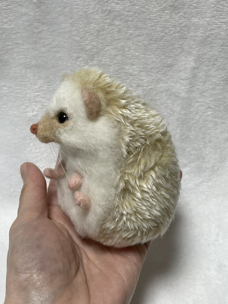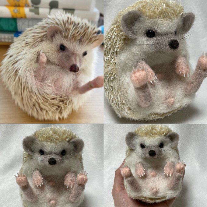 ハリネズミのサリーちゃん完成💖 なかなか苦戦しましたが、なんとか サリーちゃんになりました😆 チンチラと違う爪や背中の針布の使い方 いろいろ勉強になりました✨ 1枚目は本物サリーちゃんです💕 #ハリネズミ #うちの子ぬいぐるみ #羊毛フェルト