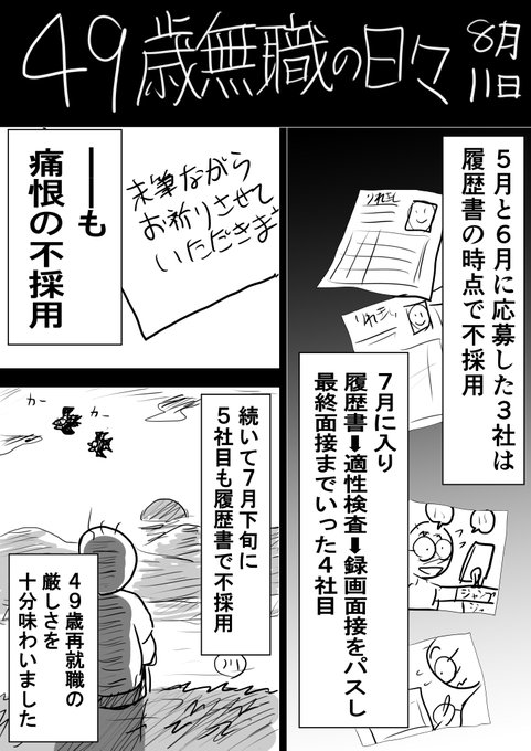『49歳無職の日々』7月19日 少しのことが全体のことに見えてしまう… 主語が大きくなってしまう 些細なことで自分全てが否定された気になってしまう 自分のそういう弱さが大嫌いだなぁ #漫画が読めるハッシュタグ #転職活動
