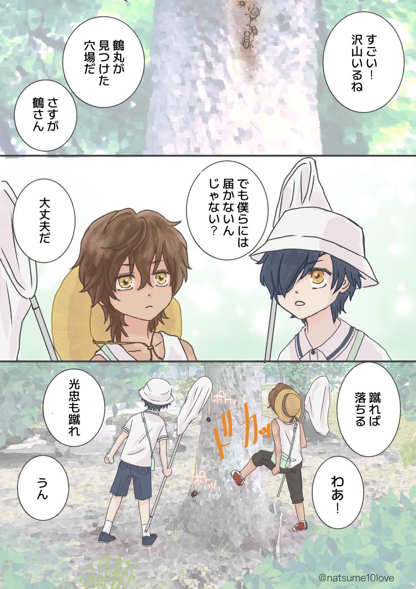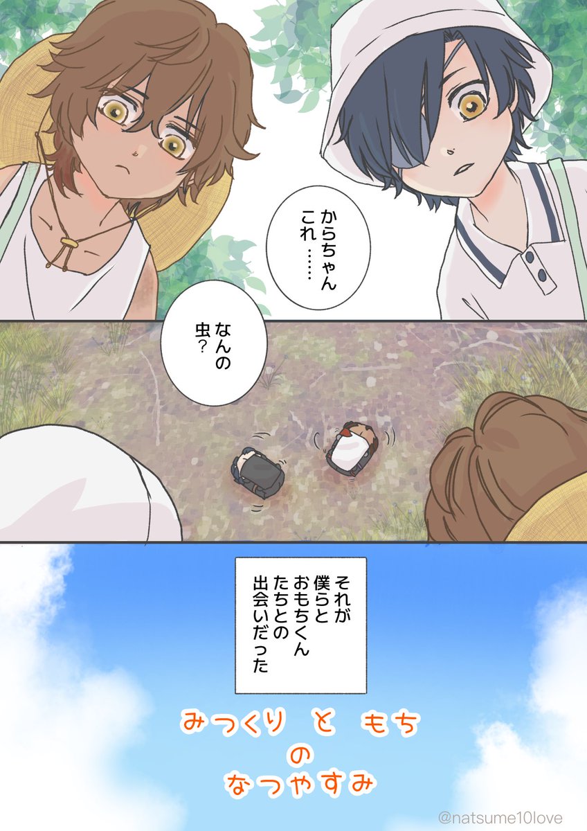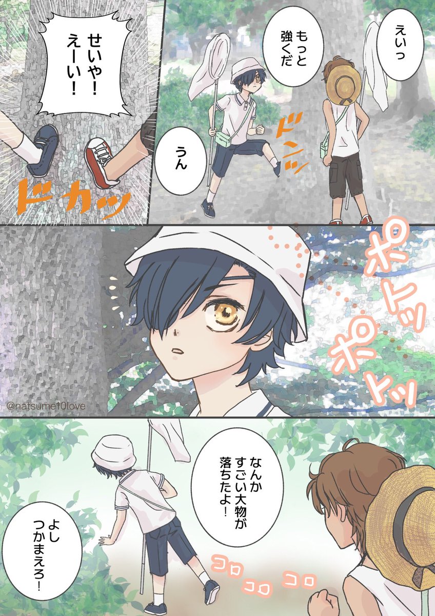 #みつくりのなつやすみ 〜残暑見舞い編〜 「なつやすみ」ときいて最初に浮かんだのが虫取りするしょた🍯🌰 人生初のしょたマンガで等身バランスむずくて時間かかっちゃいましたが何とか間に合いました🌻 🍯🌰とおもちの夏休みはまだこれからだ🍉