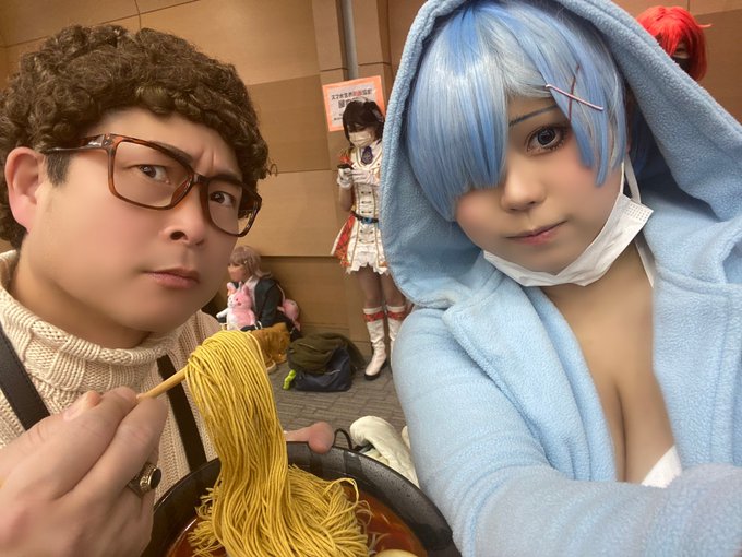 となコス初日のめもりゐ。 マロスさん(@mamamamamarosu)のレムりんと2ショ。 ※ラーメン持ってるアラフィフ珍獣レイヤーが写ってますが気にしないでください。 気にしないでください。 気にするなって言ってんだろぉがぁ!!!!!!! #となコス #コスプレイヤーさんと繫がりたい #ラーメン