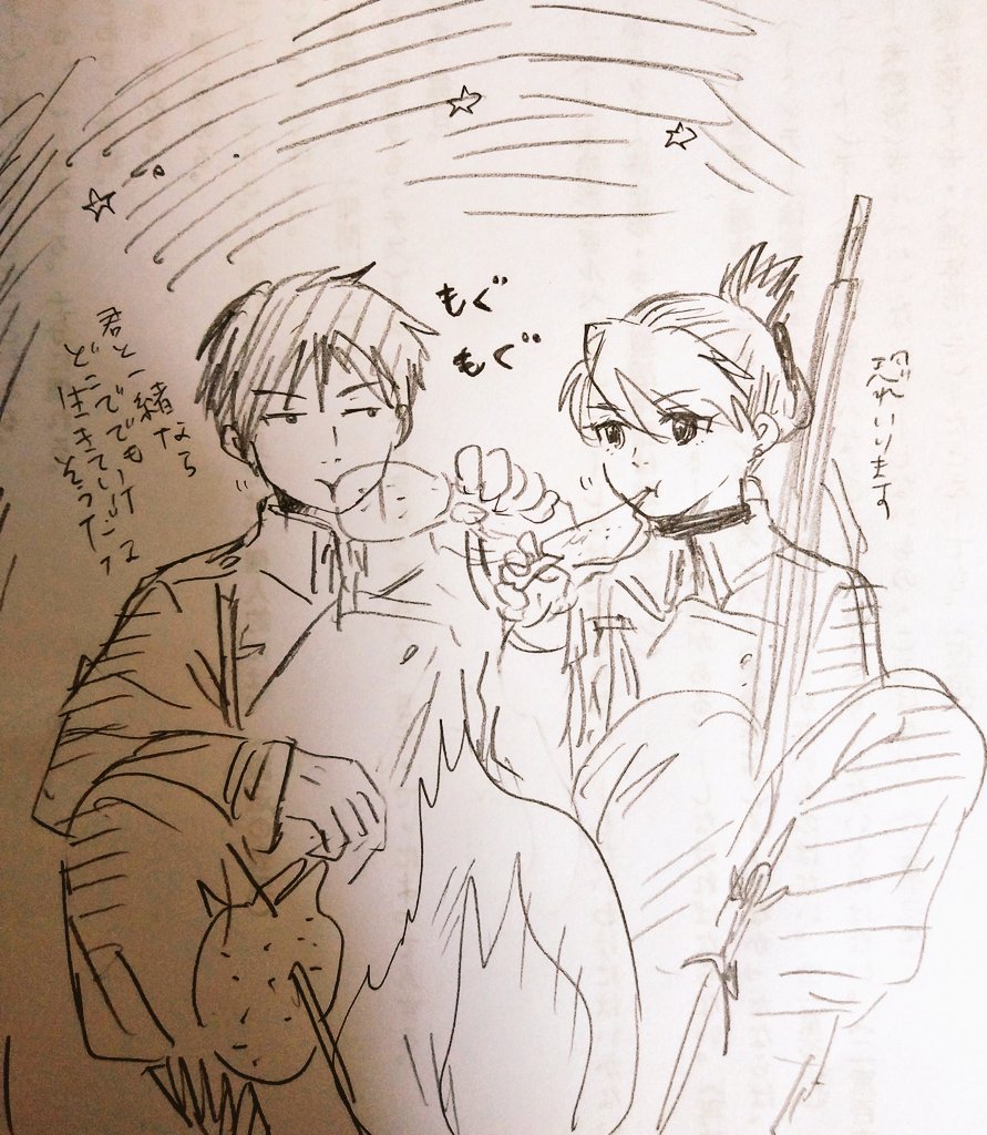 #リプをもらった番号の色を使って絵を描く ロビさん(@robi_zatta)からのリクエストで、鋼で思いでセピア~! パピーのマグカップ割っちゃって困ってたリザちゃんのためになおしてくれたマスタング的な。 厚塗り久々で楽しかったです。