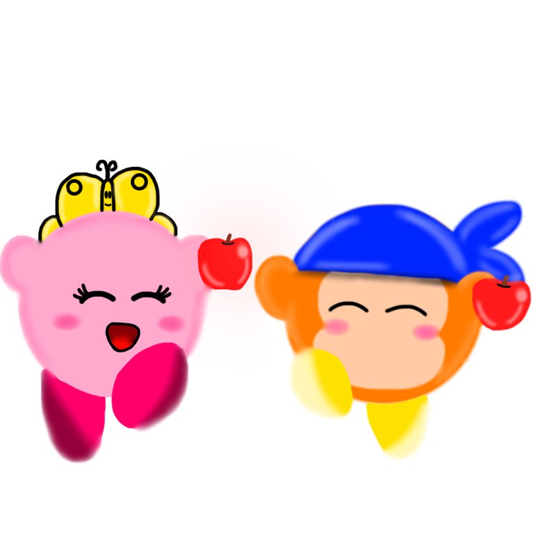 ナッツカービィとバンダナワドルディでいそうにりんご🍎🍏食べるところ描いてみた💙🧡🦋💗 #イラスト #カービィ絵描きさんと繋がりたい