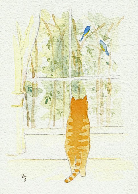 窓の外を見る猫。 5/21~25、小満(しょうまん)蚕起食桑(かいこおきてくわをはむ)あらゆる生命が満ち、太陽の光を浴び成長する季節です。ルリビタキを見ているトラ猫の絵です。若葉して猫と鳥と喧嘩哉・一茶。 #24節気72候 #猫の絵