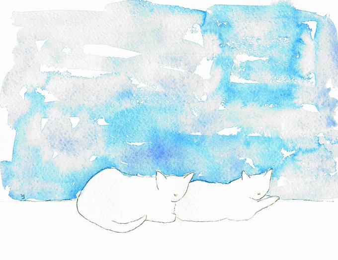 青空の下の猫。 梅雨の晴れ間を楽しむ兄弟猫です。 #猫の絵