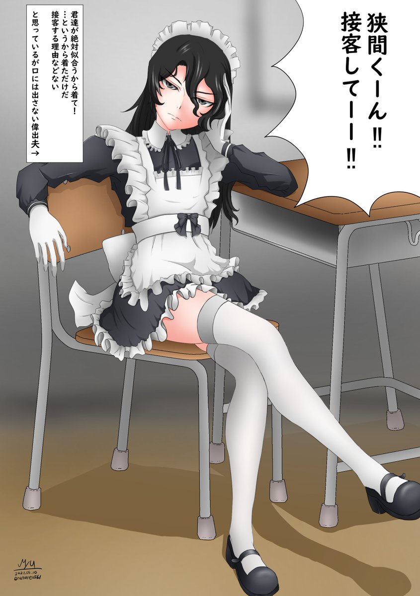 13 58 文化祭でメイド喫茶をやることになった狭間偉出夫を描きました😃 普通髪型と、ウィッグつけさせられた髪型🙃 21/08/10 08:49