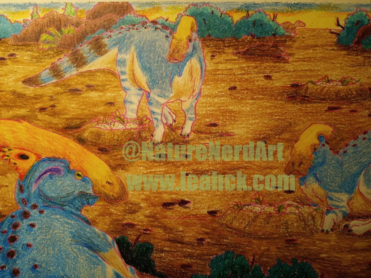 #Crayon drawing number two! A #Parasaurolophus family group - the drake looking over his hens. #paleoart #paleontology #artwork #nature #dinosaurs