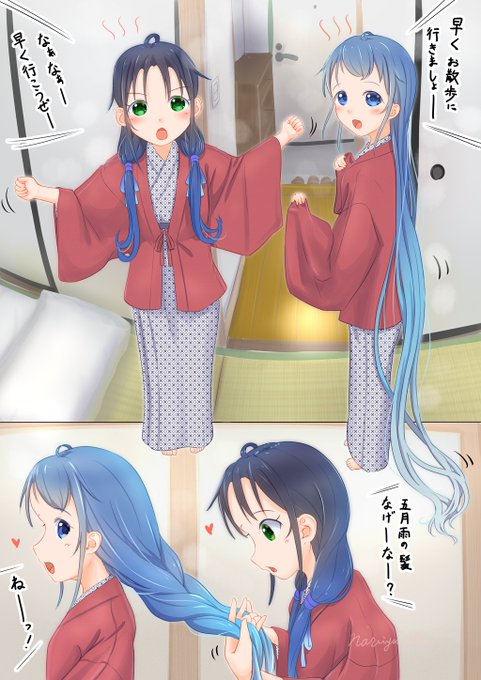 旅館で夕食後にひとっ風呂浴びた後の、ホカホカさみすず。#艦これ だいたい1kmほど歩いた先にあるコンビニでアイスを買うのが目的。