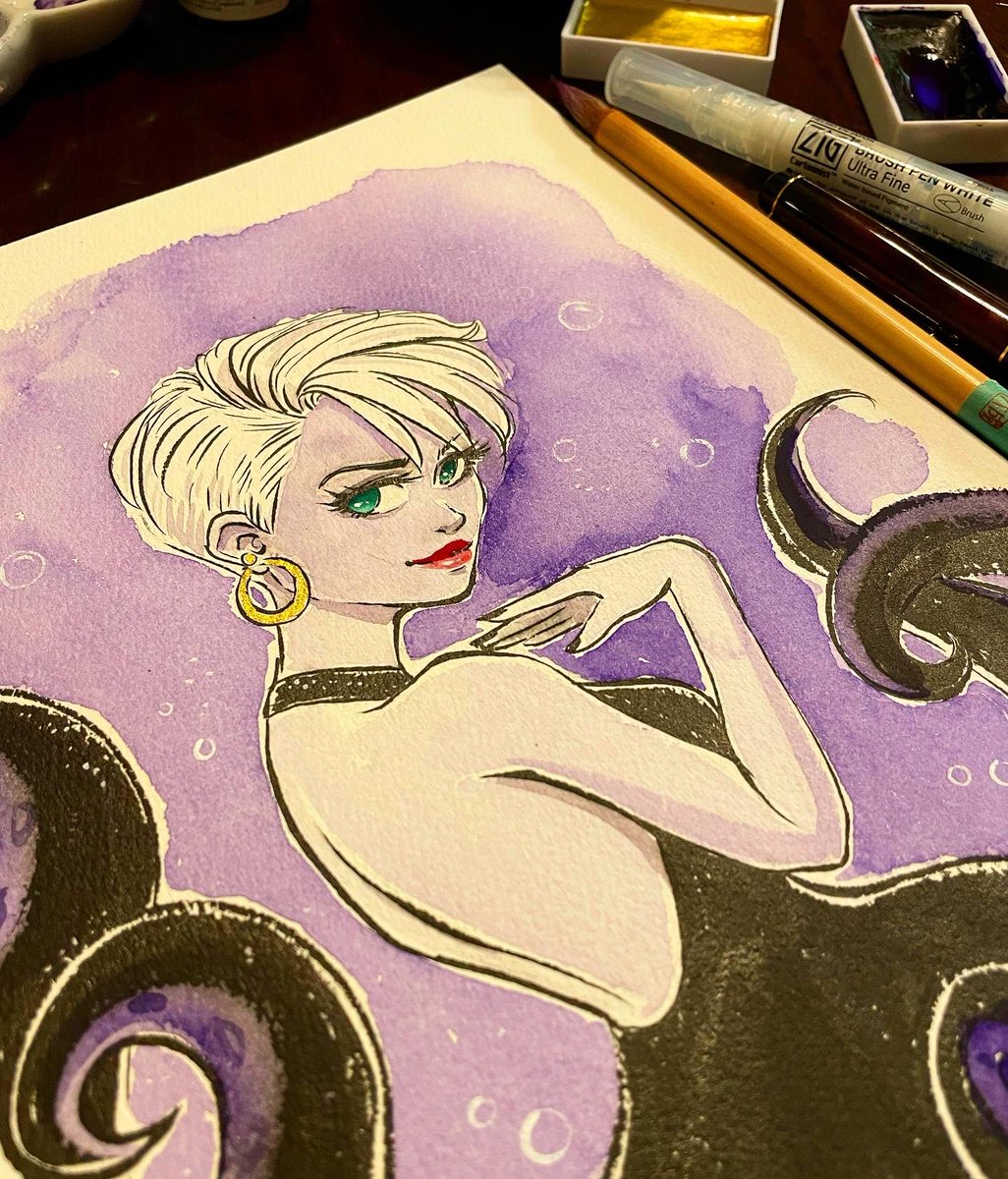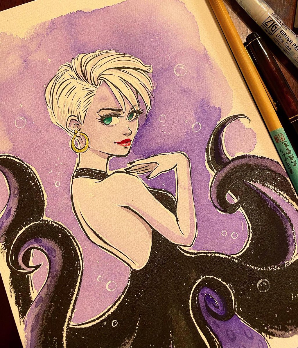 Day 9: Ursula from @camilladerrico ‘s #drawlloween I had a nice vacation in Colorado for a week, but I’m happy to be home!! My shop is going to be back open and I will start adding prints on Etsy and originals on my website tomorrow ☺️ #inktober2021 #camillasdrawlloween #ursula
