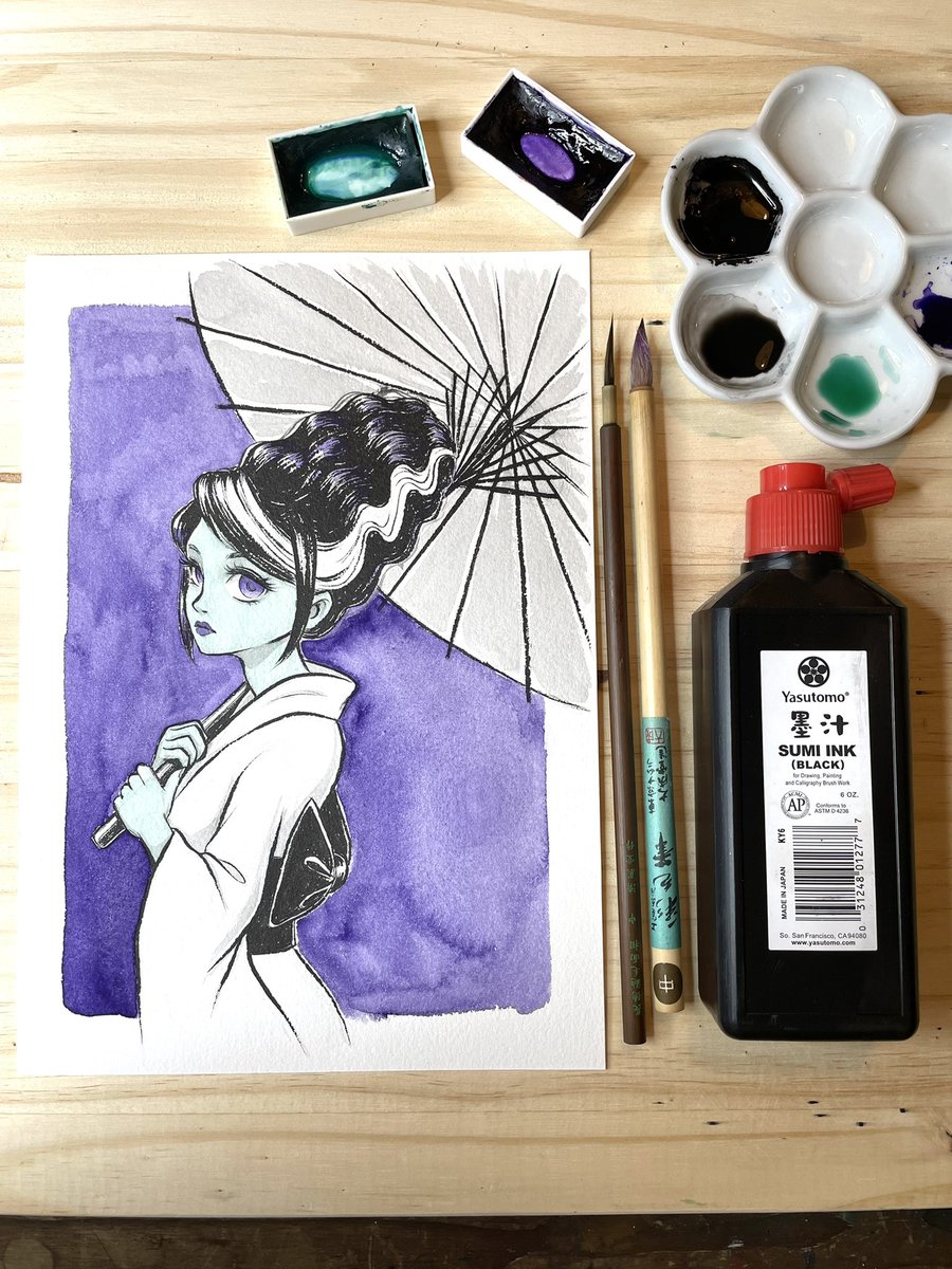 Bride of Frankenstein . Materials: Arches cold press watercolor paper, @yasutomo_art sumi ink, @seishindoabe weasel hair menso brush, @kissho_nihonga watercolor . #inktober #inktober2021 #kuretake_inktober #kuretake_inktober2021 #frankenstein #brideoffrankenstein #watercolor