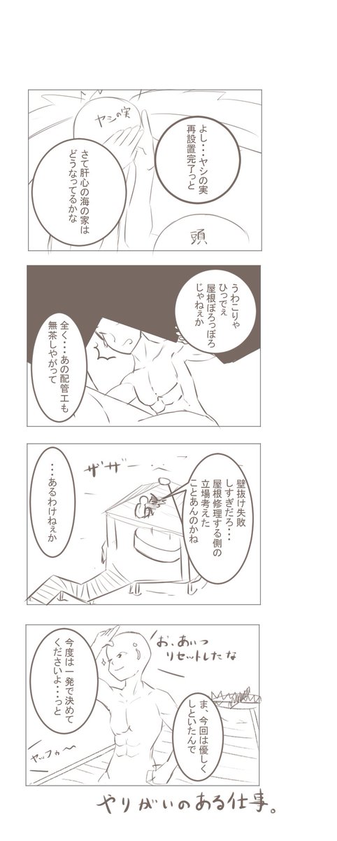 9 46 漫画描いてみたいなぁと思ってトーボウさんのファンアート漫画を練習のネタとして描いてみた。 これ本人に見せられるレベルかわからんので、とりあえずこの漫画の意味が分かるRTA好きに届け・・・笑 「ヤシ抜け修繕職人」 22/01/13 00:14
