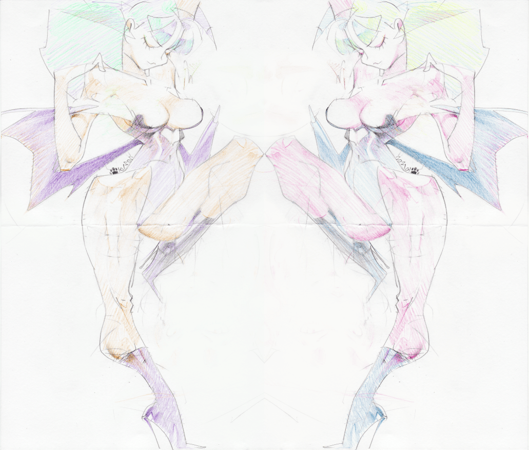 #格ゲーキャラ描こうぜ #モリガン #Morrigan #ヴァンパイア #Darkstalkers イエローベースとブルーベースのモリガンさん。 ぜんぜん追いついてませんが、初代ヴァンパイアの色彩をリスペクト。 阿吽の像みたいw 画用紙に鉛筆、水彩色鉛筆で着彩。
