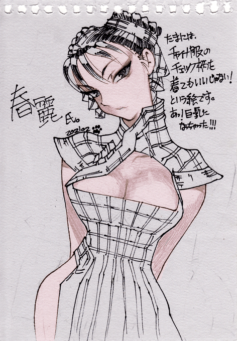 #格ゲーキャラ描こうぜ #春麗 #Chunli #ストリートファイター #StreetFighter ゼロ春さんに、チェック柄チャイナ服を着せてみました。 昔のカプコン顔をリスペクト。 水彩紙に、マジックペンで線画、シャーペンで影付け、肌色部分のみデジタルで着彩。 つい巨乳にしがちな、私の悪い癖!
