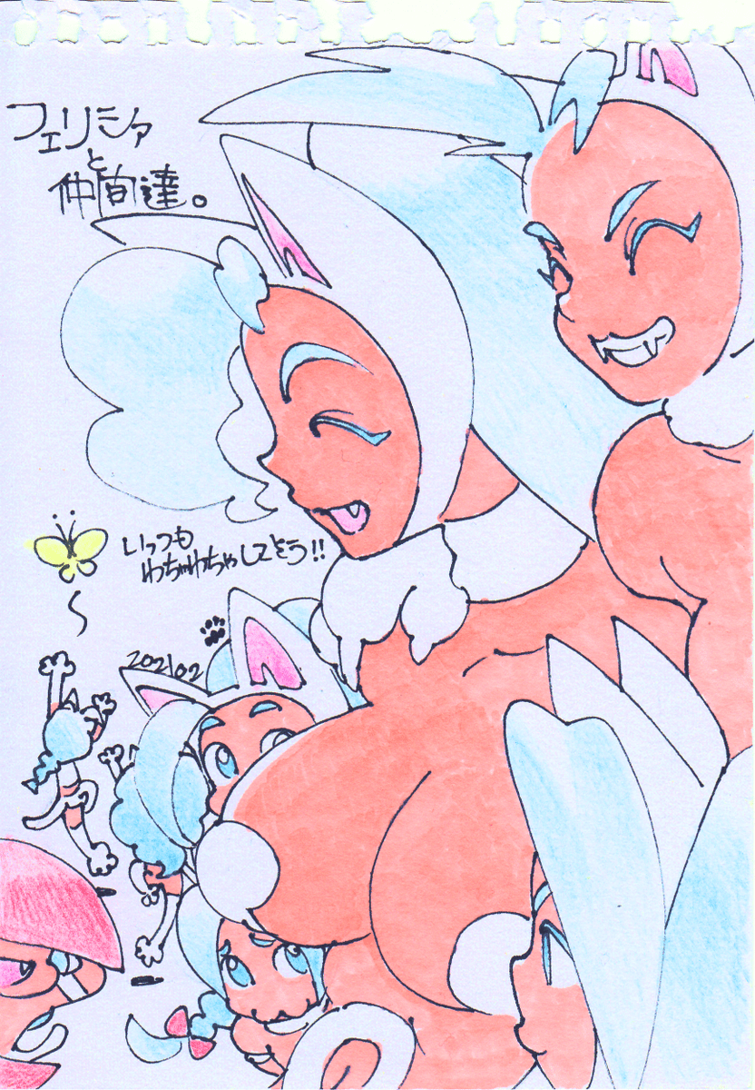 #猫の日 #格ゲーキャラ描こうぜ #フェリシア #Felicia #ヴァンパイア #Darkstalkers フェリシアの技「プリーズヘルプミー」で出てくる仲間達です。 普段からわちゃわちゃしてて欲しいです。 水彩紙にマジックペンの線画、色鉛筆とコピックで着彩。