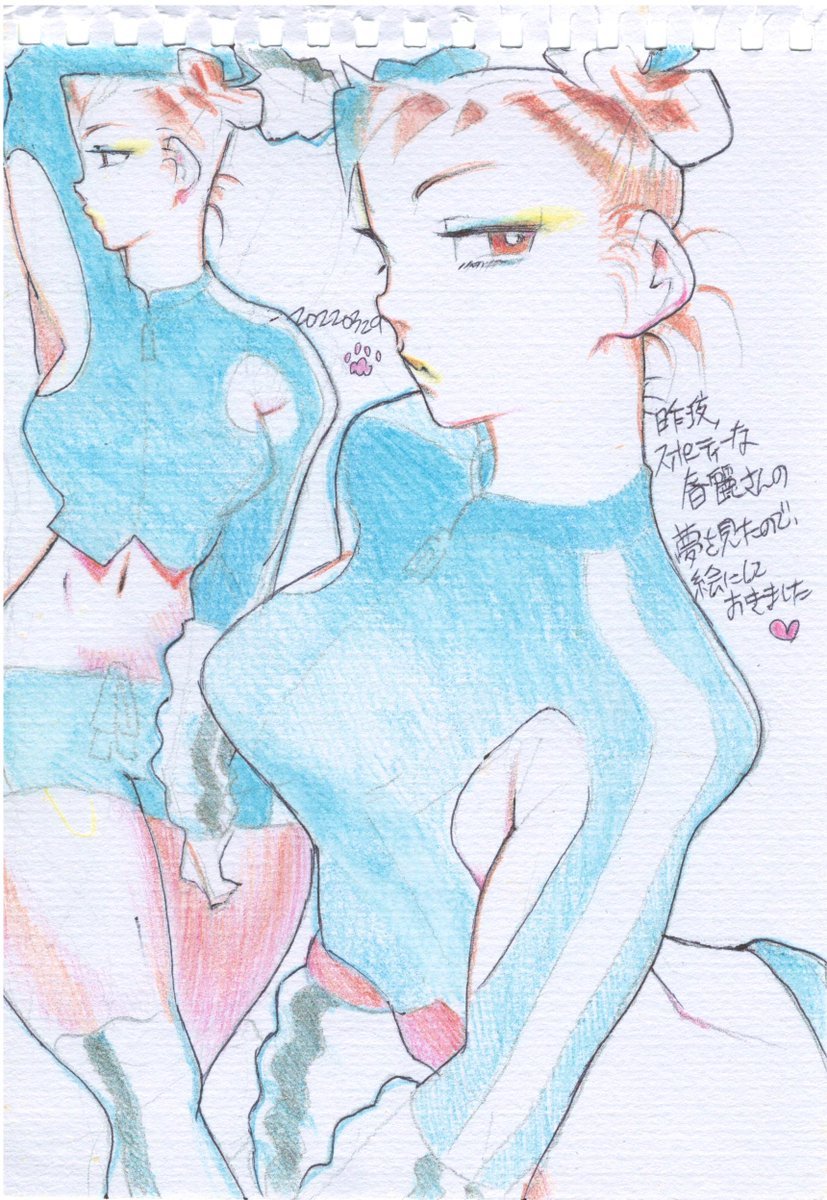 #格ゲーキャラ描こうぜ #春麗 #Chunli #ストリートファイター #StreetFighter 昨夜、スポーティな春麗さんの夢を見たので、絵にしておきました!脇とへそ出しがポイントです。 水彩紙に、ボールペンでアウトラインを引いて、水彩色鉛筆で彩色。