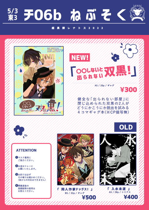 🤕5/3 レナトス 新刊サンプル🎩 『〇〇しないと出られないヌヌ黒!』 健全な「出られない部屋」に閉じ込められた2人のゆるっとした4コマギャグ本です。※CP描写無 5/3 東1 チ06b ねぶそくにて頒布予定です! ■pixiv:pixiv.net/artworks/97756… ■委託先:ec.toranoana.jp/joshi_r/ec/ite…