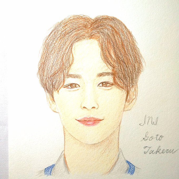 INIの後藤威尊くんの個性を知るべく似顔絵を描いてみる 後藤くんといえば、、、 ・威尊の読み方はたける ・ストイック王子👑 ・あだ名は竹千代 ・「きゅうりニダ🥒」 #INI #INIfanart #後藤威尊 #GOTOTAKERU #色鉛筆画 #11人全員描いてく