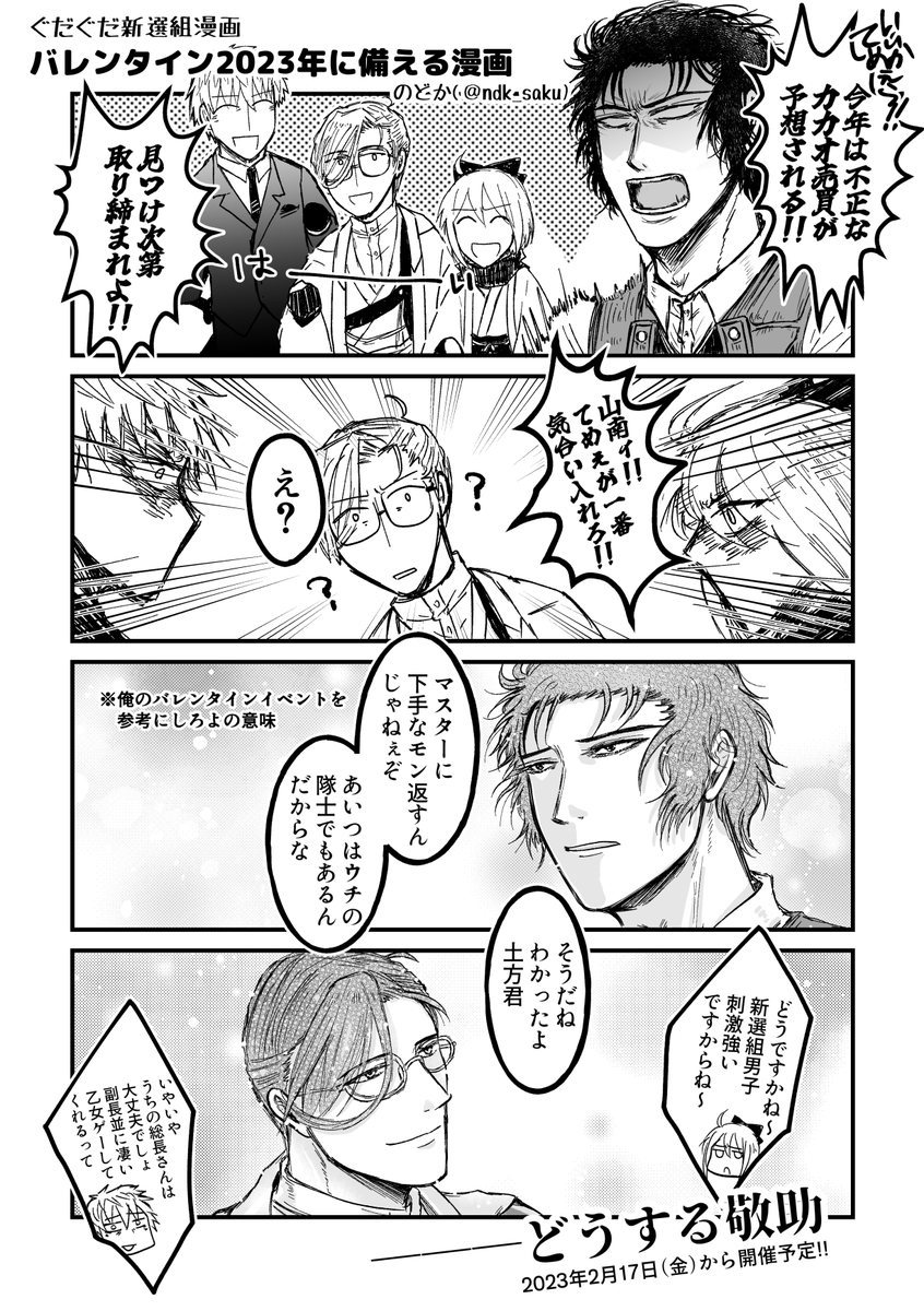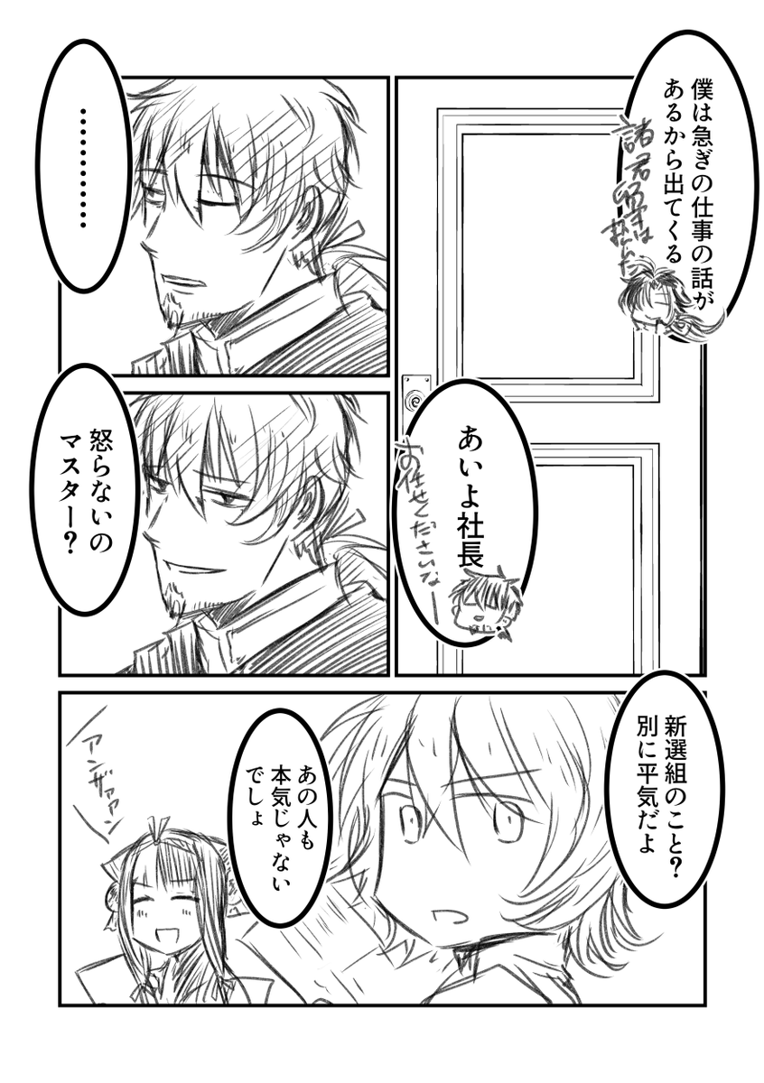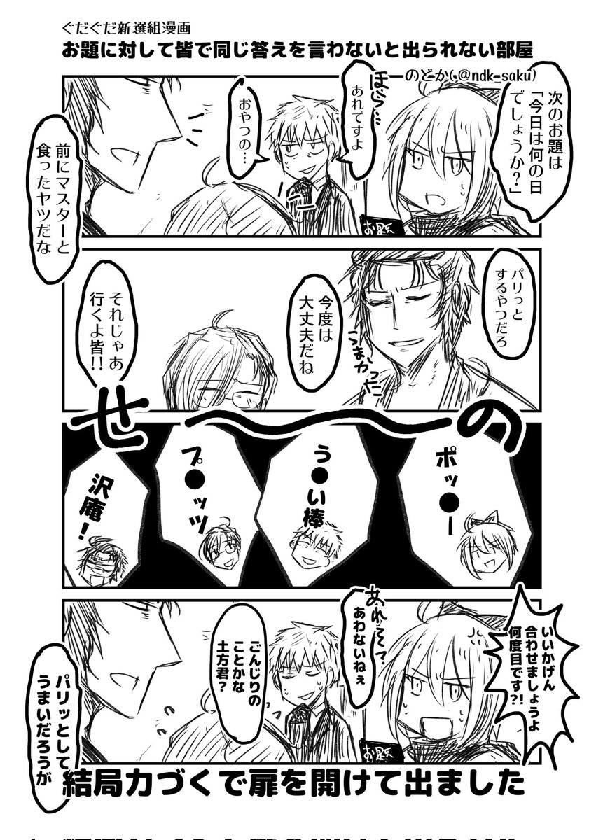 検索に引っ掛からなかったから再放送する。またこういうの描きたい(ネタストックはある) ぐだぐだ新選組がお仕事をする漫画三部作 | のどか #pixiv pixiv.net/artworks/91116…